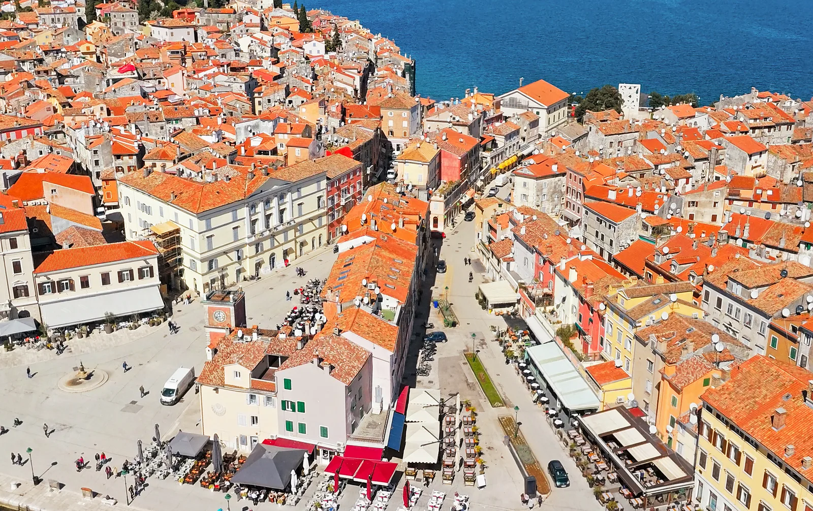 Popni se na zvonik Sv. Eufemije (košta par eura, stepenice su uske, ali isplati se svaki korak). S vrha imaš pogled u krug od 360 stupnjeva — narančasti krovovi koji se spuštaju prema moru, arhipelag u daljini, a po vedrom danu vidi se i talijanska obala. To je taj pogled iz zraka na Rovinj.