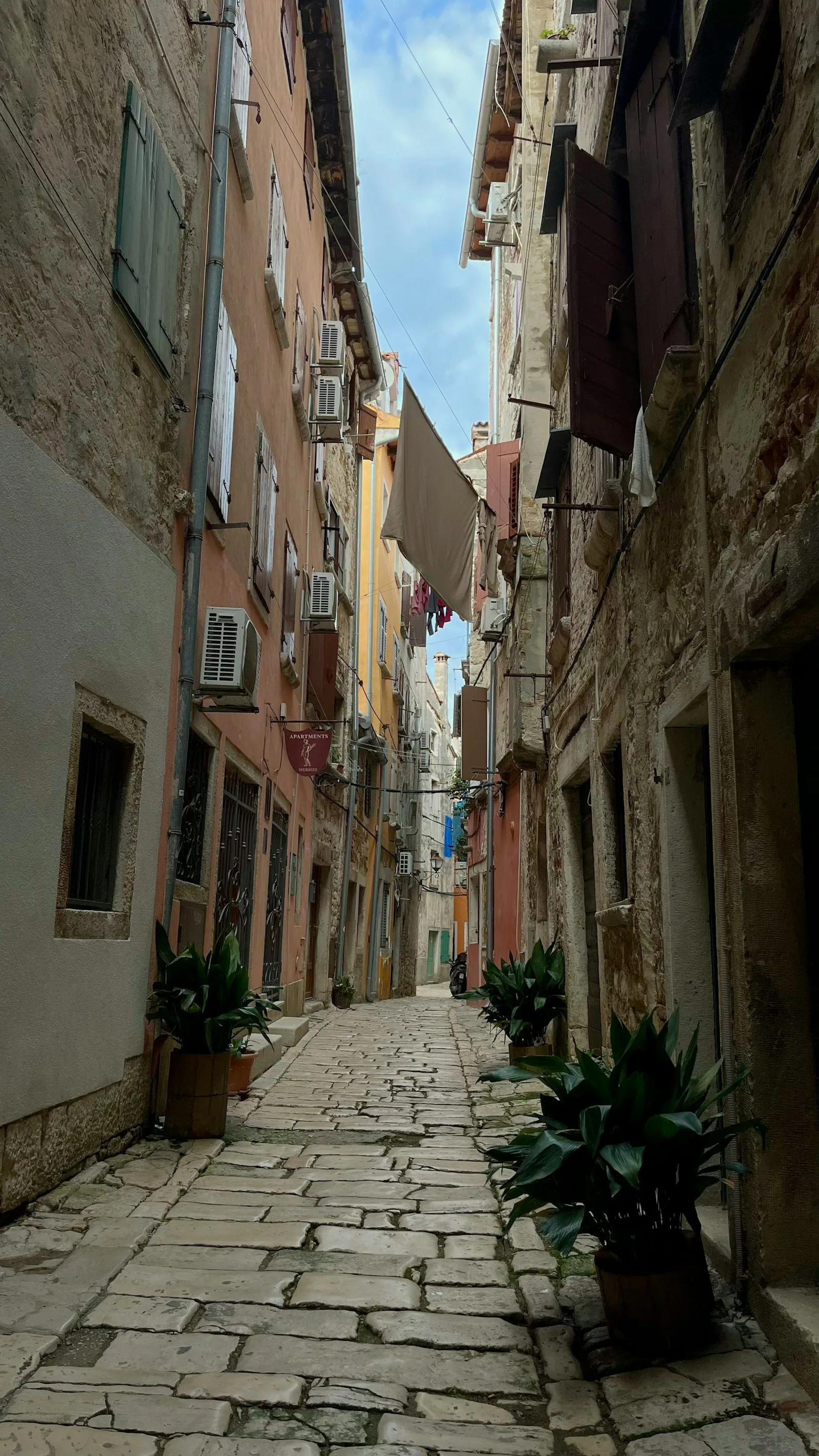 Tu je čar. Ulice u starom gradu su nestvarno uske — neke jedva šire od tvojih ramena. Kaldrma pod nogama, rublje obješeno između kuća iznad glave, mačke koje spavaju na pragovima, Vespe naslonjene na stare kamene zidove. Svaki ugao je gotov kadar.