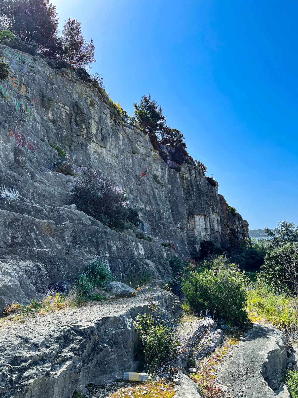 Nascoste nei pini dietro la costa si trovano i resti di un'antica cava di pietra, le sue pareti verticali pallide sono favorite dagli arrampicatori — vedrai i chiodi nella roccia e talvolta un'équipe di corda. È anche un posto sorprendentemente affascinante per le foto.