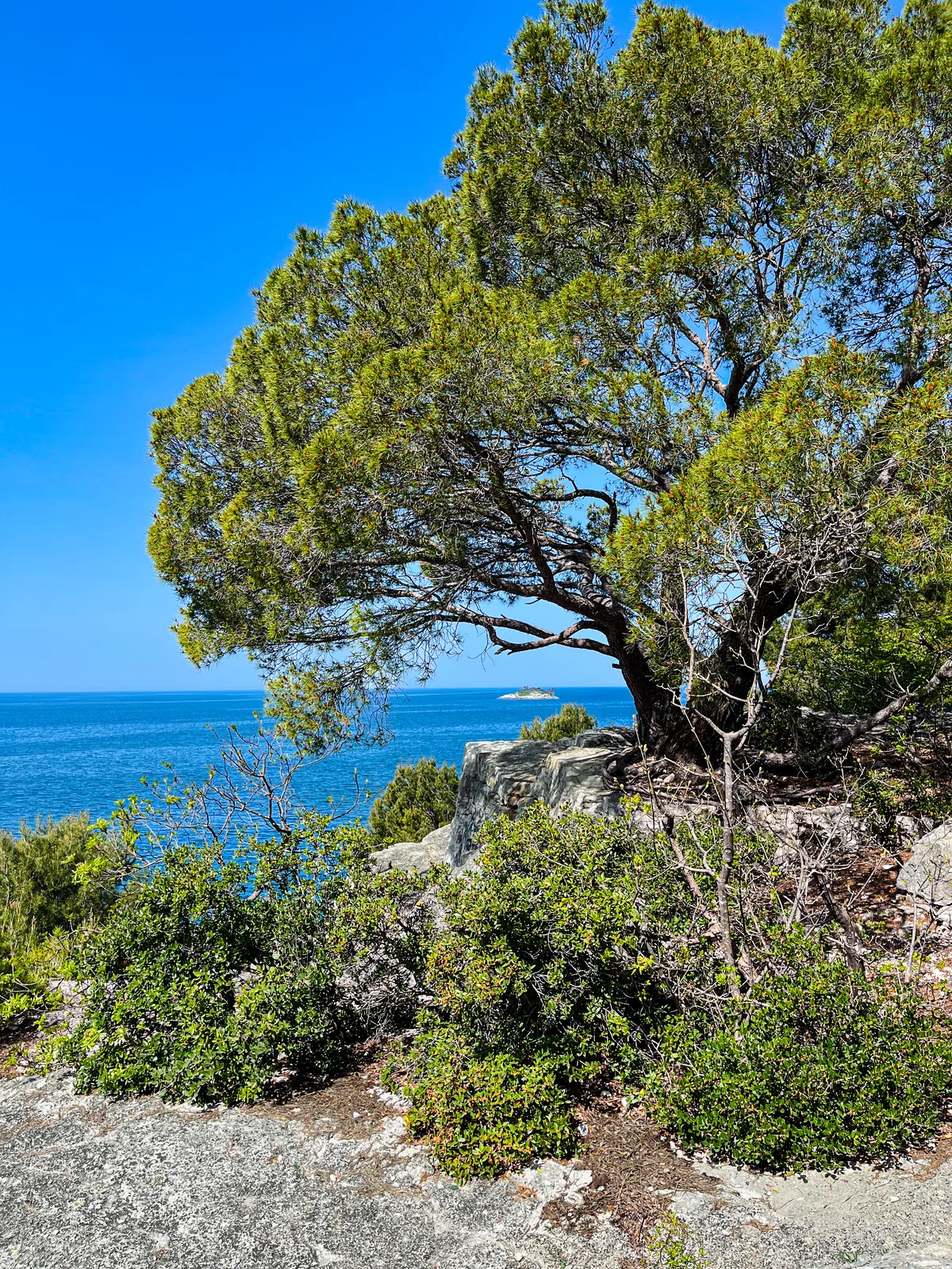 Zlatni rt è metà foresta naturale, metà esperimento botanico del XIX secolo. La base è nativa: leccio (Quercus ilex) — la quercia sempreverde che regala al parco la sua ombra fresca e profonda in agosto — e frassino da fiore. Sotto crescono gli arbusti mediterranei che ti aspetti lungo questa costa: quercia pubescente, corbezzolo, alloro, mirto, lentisco, bosso comune.