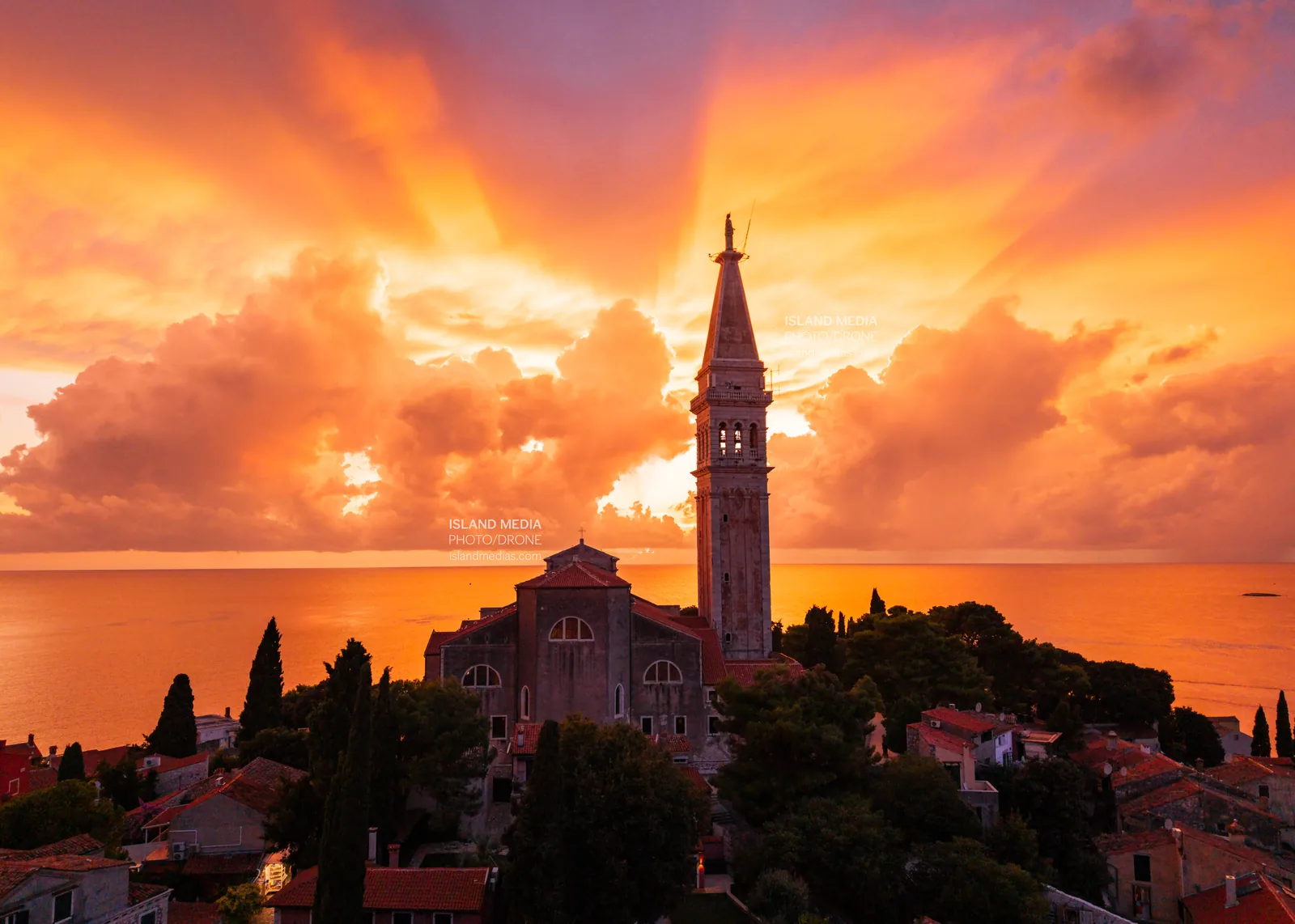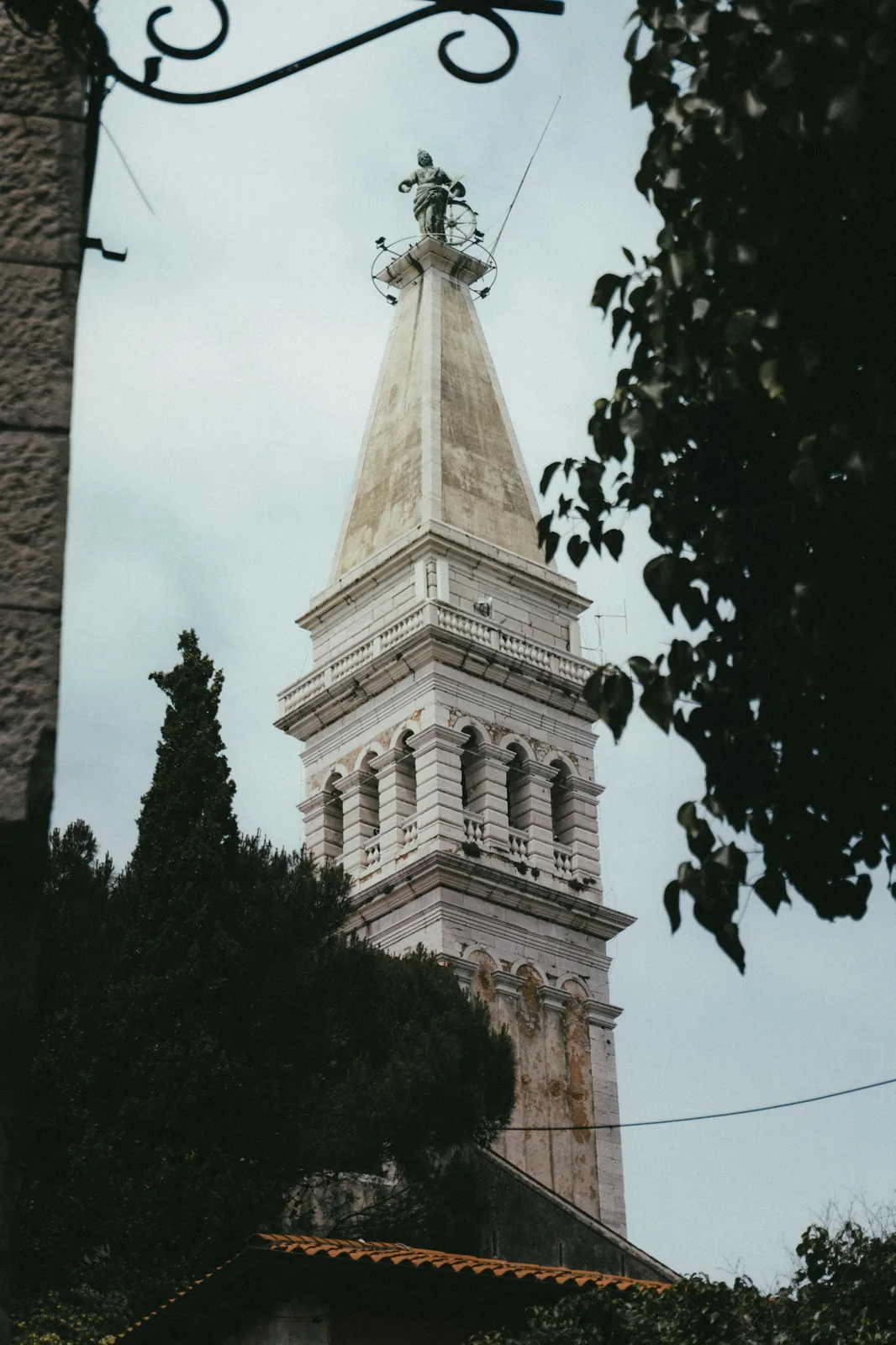If you've seen one photo of Rovinj, you've seen St. Euphemia's bell tower — the tall, slim Venetian-style spire that crowns the peninsula and points the sky from every angle of the old town. It's the tallest thing in Rovinj, the first landmark you spot from the harbour, and the last piece of the skyline to catch the evening light.