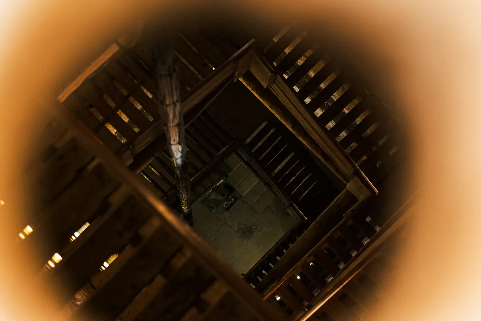 The climb is up an old wooden staircase that hugs the inside of the shaft — narrow, steep, and open-tread (you can see through the steps). There's no lift, no switchback, just 200-plus stairs, and the odd window to catch your breath. It isn't physically hard — plenty of grandparents make it up — but the see-through steps and the height make it a proper test of nerves. If you have a fear of heights or vertigo, skip it. For everyone else, the view at the top is worth the nerve.