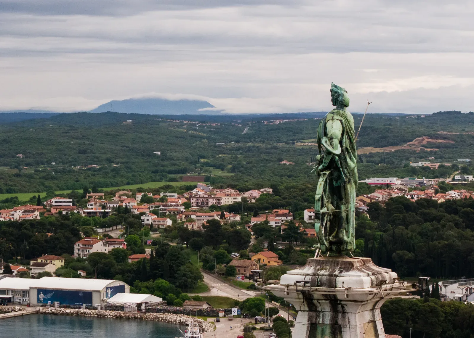 What you get at the top: a 360-degree view of the whole peninsula, the harbour and ACI marina to the east, the 22 islands of the archipelago to the west (you can see Sveta Katarina and Crveni Otok clearly), the Punta Corrente forest park to the south, and on a clear day the Učka mountains far to the east across the Adriatic.